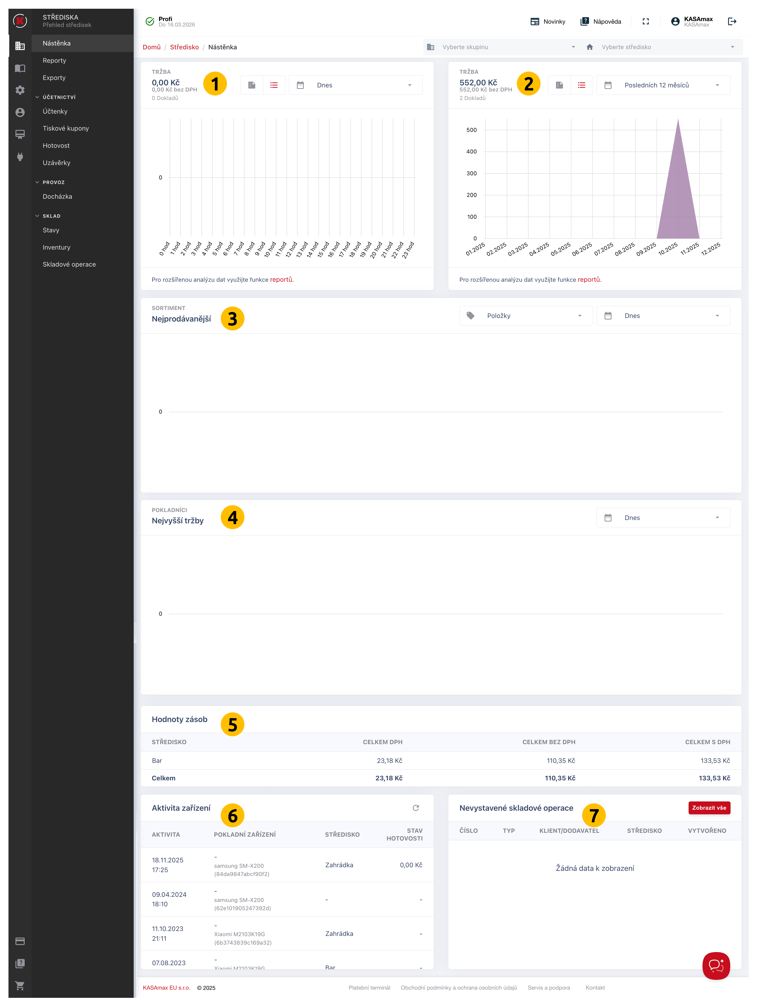Aktivita zařízení (6) zobrazuje všechny pokladní zařízení Vašeho účtu. Propis zařízení k účtu probíhá během prvního přihlášení do aplikace Pokladna KASAmax na daném zařízení. Mimo výpisu všech zařízení můžete sledovat také jejich aktivitu. Zelená tečka indikuje, že zařízení je v současné chvíli připojeno k síti a komunikuje s KASAMax Backoffice. Naopak tečka červená značí aktuální nedostupnost zařízení v sití. Z tabulky můžeme také vyčíst datum a čas poslední aktivity.