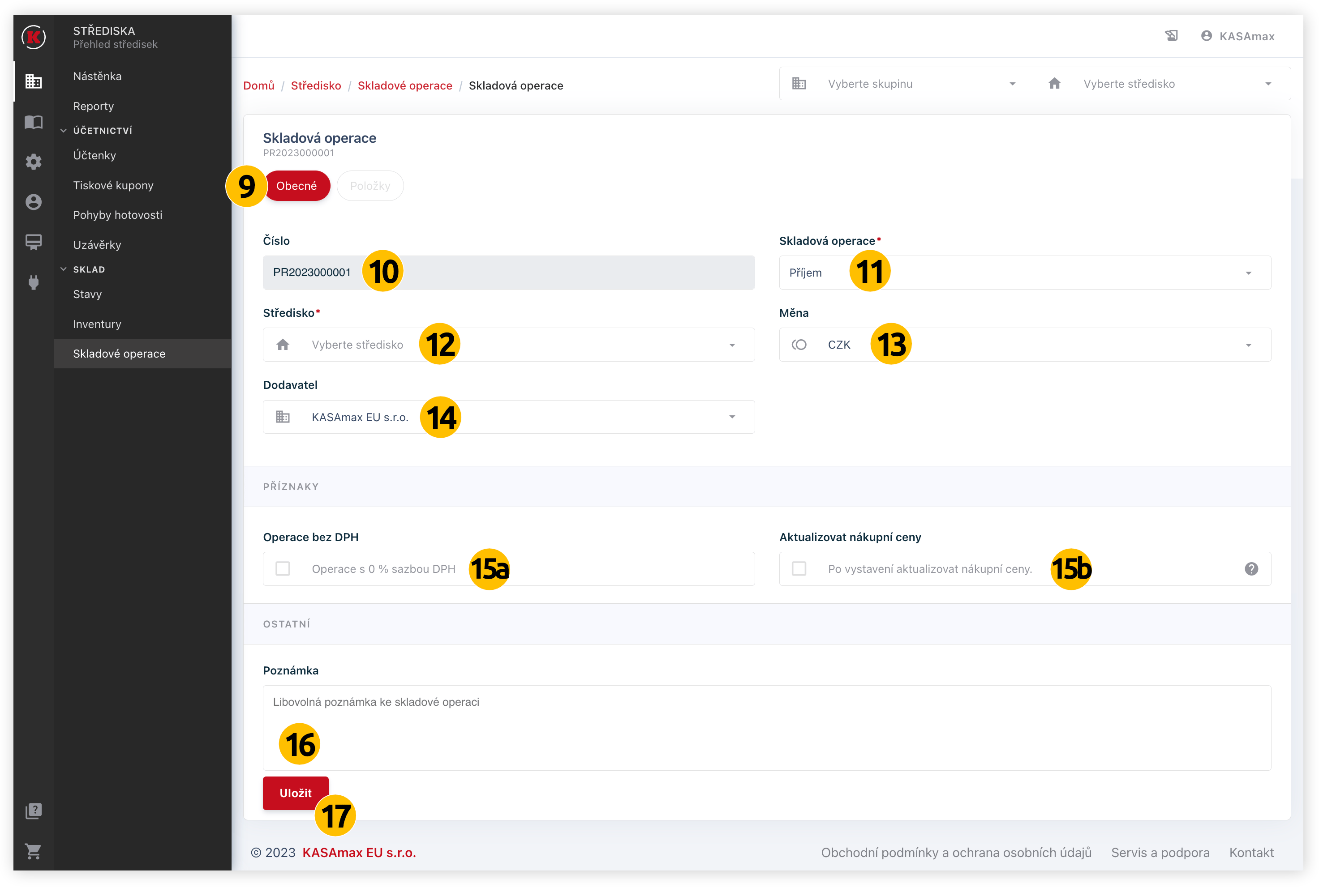 Na detailu skladové operace probíhá nastavení všech potřebných atributů. Většinu nastavení je možné dále upravovat. Uložení provedených změn nebo vytvoření nové operace provedete kliknutím na tlačítko Uložit (17).
