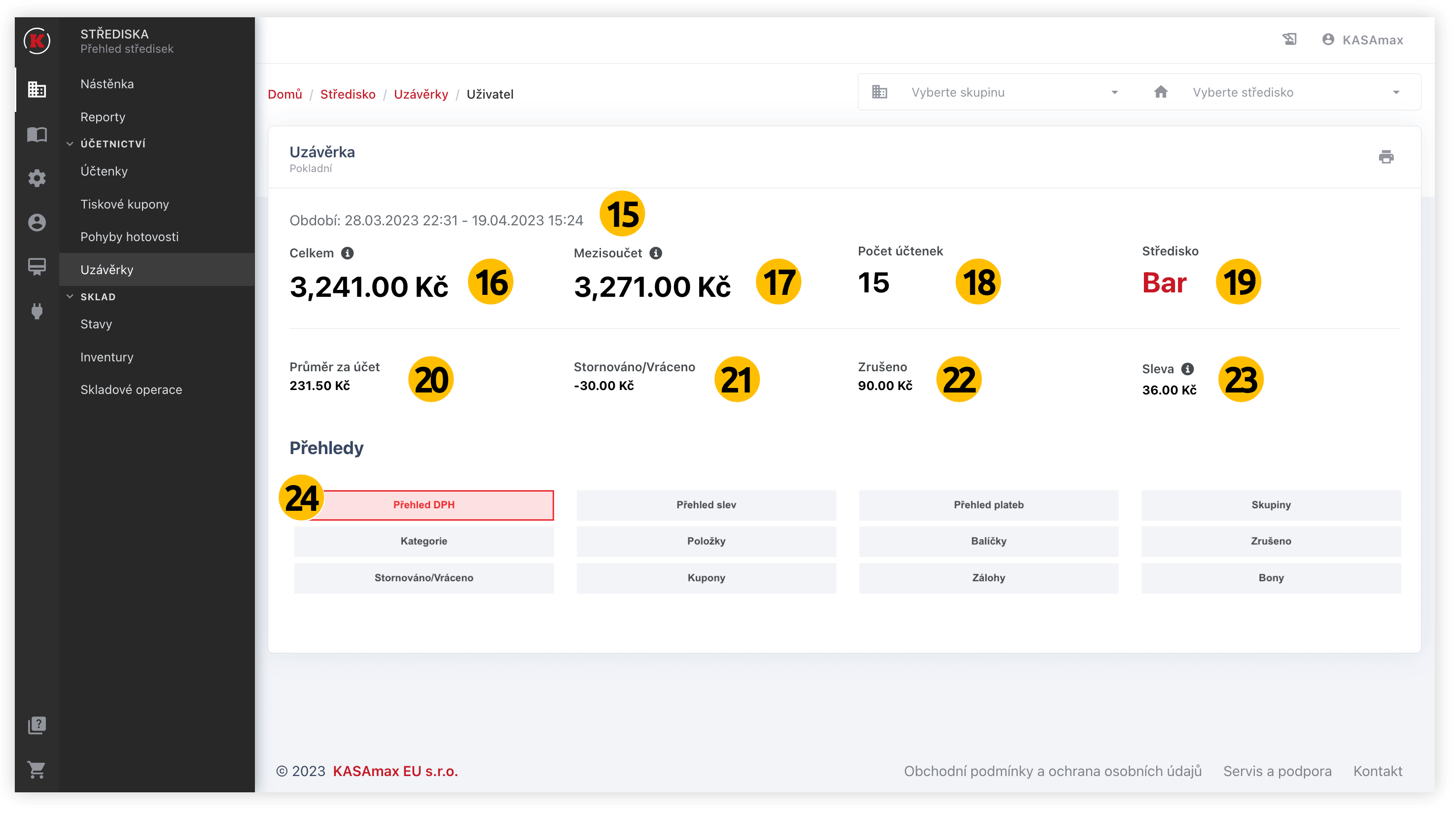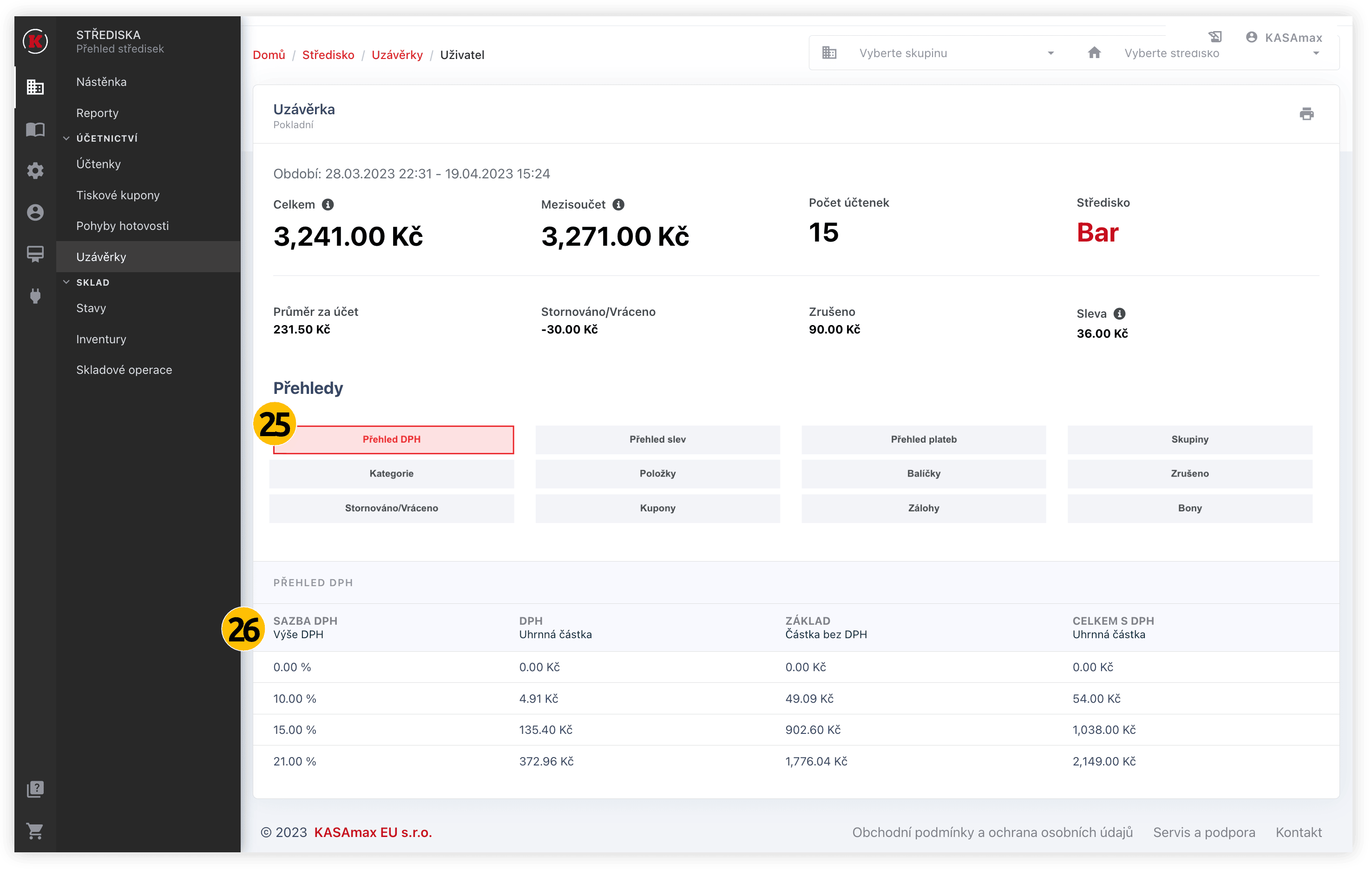 V detailu uzávěrky máte možnost se překlikávat mezi jednotlivými detaily přehledu (25). Zde máte možnost zobrazit přehled DPH, přehled slev, plateb, skupiny, kategorie, položky, uhrazeno, zrušeno, stornováno/vráceno, kupony nebo přehled záloh.