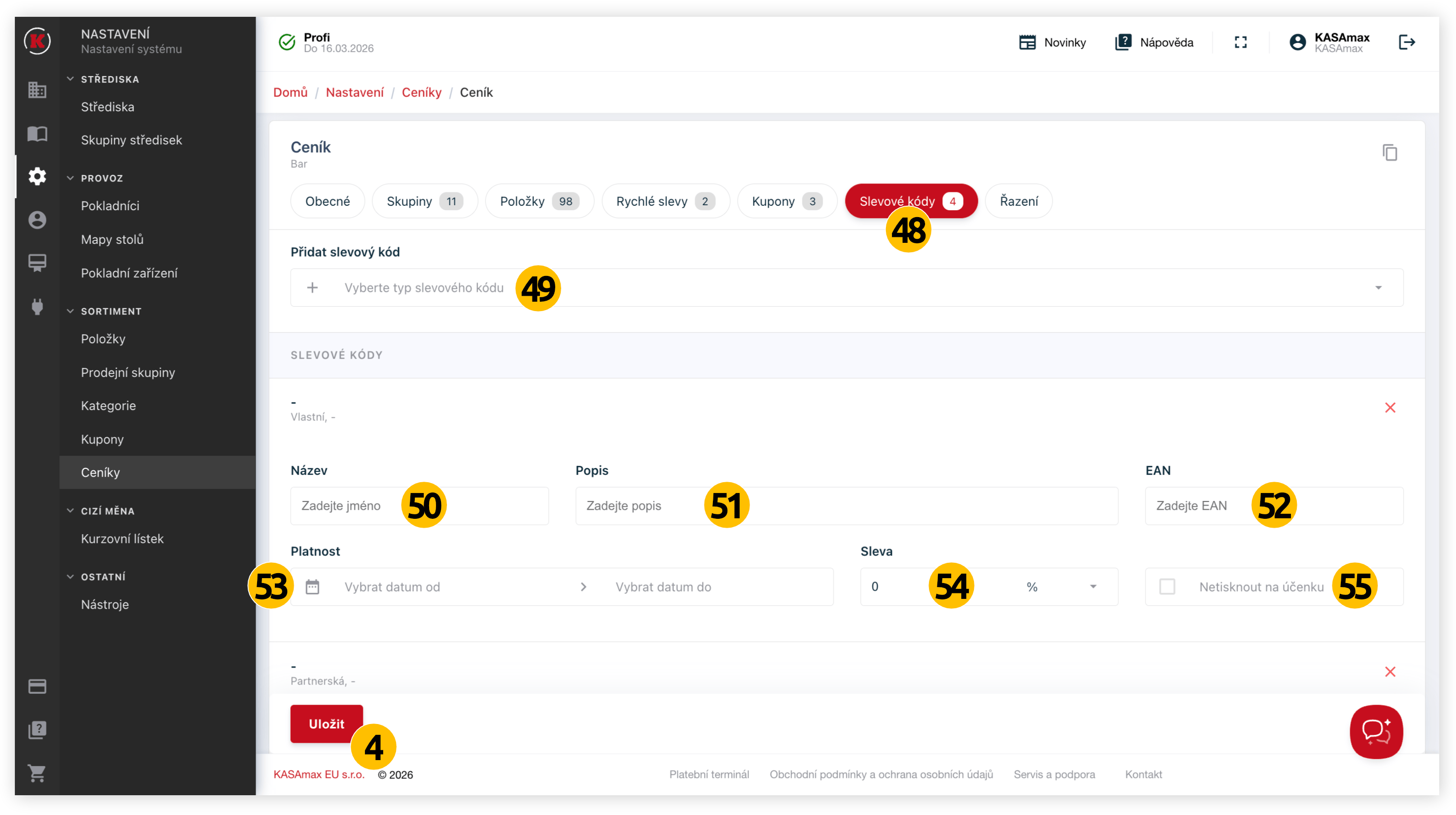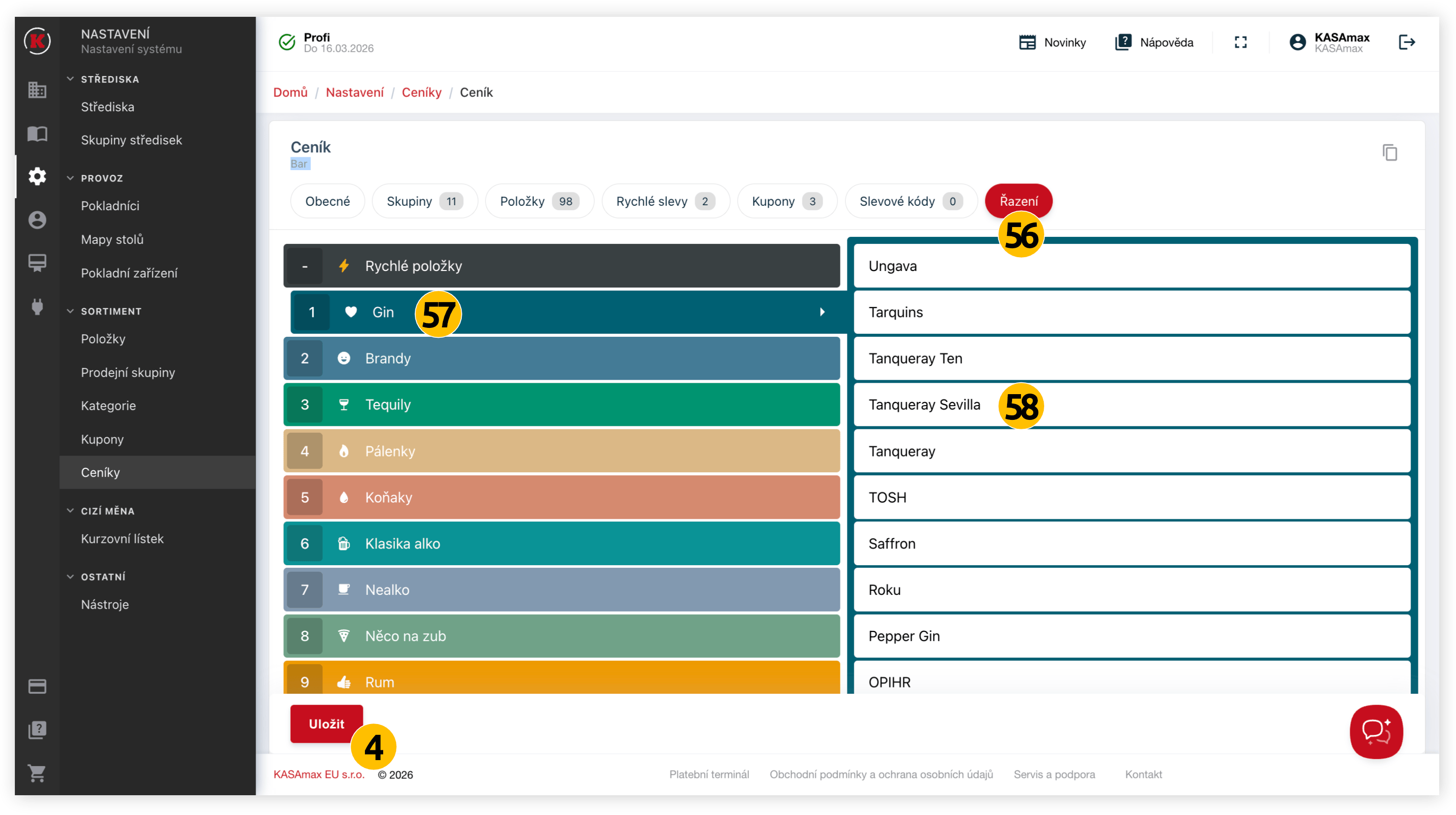 Vaše úpravy vždy uložte pomocí červeného tlačítka "Uložit" (4). Ceníky také můžete jednoduše kopírovat pomocí ikony v pravé horní části hlavního obsahu (5).