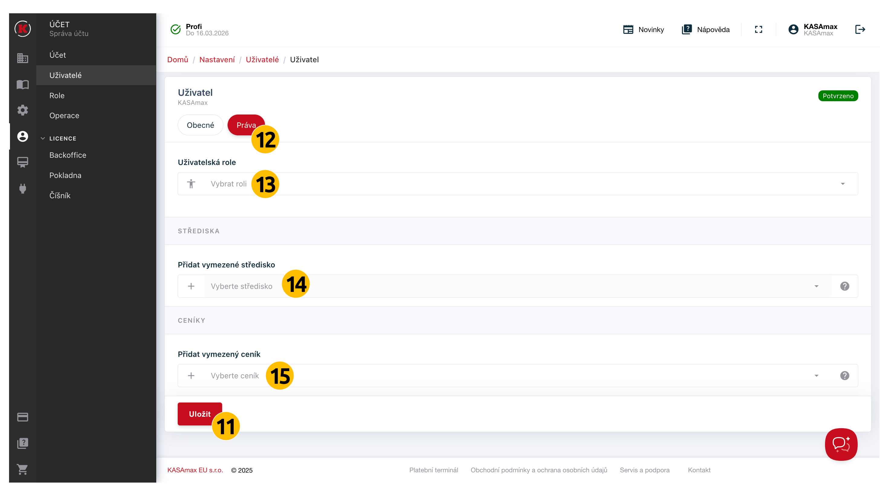 V záložce práva (12) máte možnost upravit práva vybraného uživatele. Vybíráte roli (13), vymezené středisko (14) a možnost přidat vymezený ceník (15). Pokud nemá uživatel roli ani středisko upřesněny v rozhraní aplikace nemá žádná omezení.