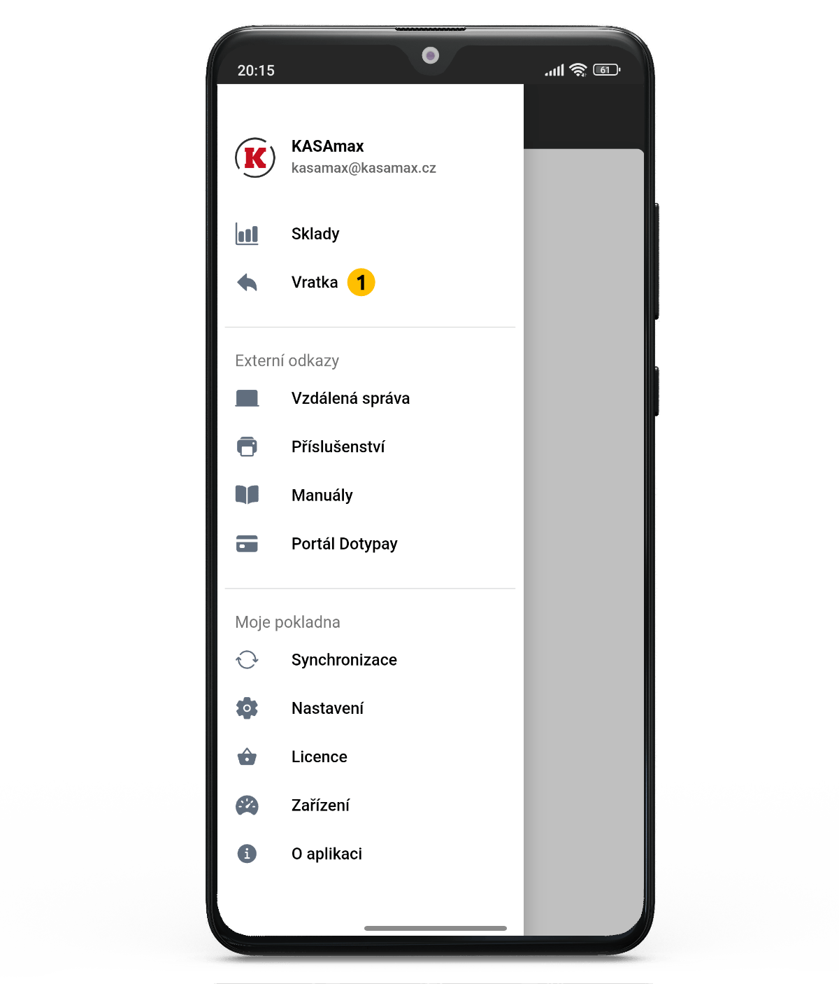Vrácení platby resp. položky na účet provede v mobilním číšníkovi přes postranní menu (1).
