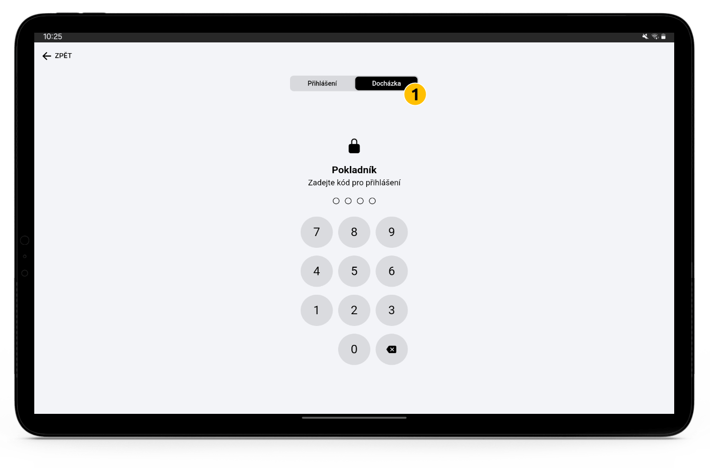 Při spuštění prodeje se na pokladně nejprve zobrazí obrazovka s možností přihlášení nebo zadání docházky (1). Po přihlášení je pokladník automaticky zaevidován.