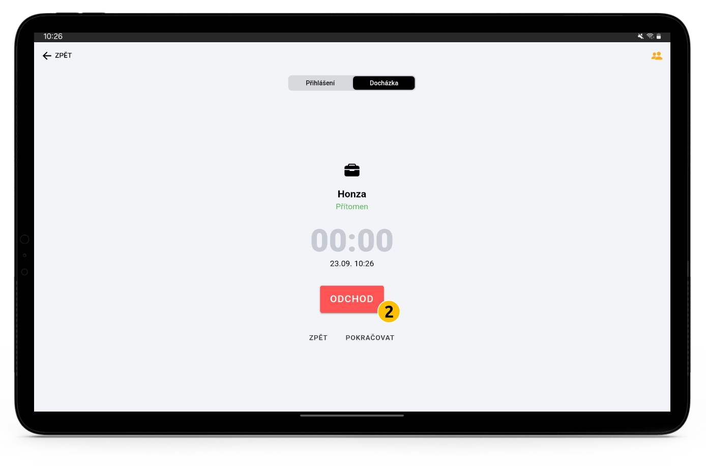 Na obrazovce docházky je možné zadat odchod (2).