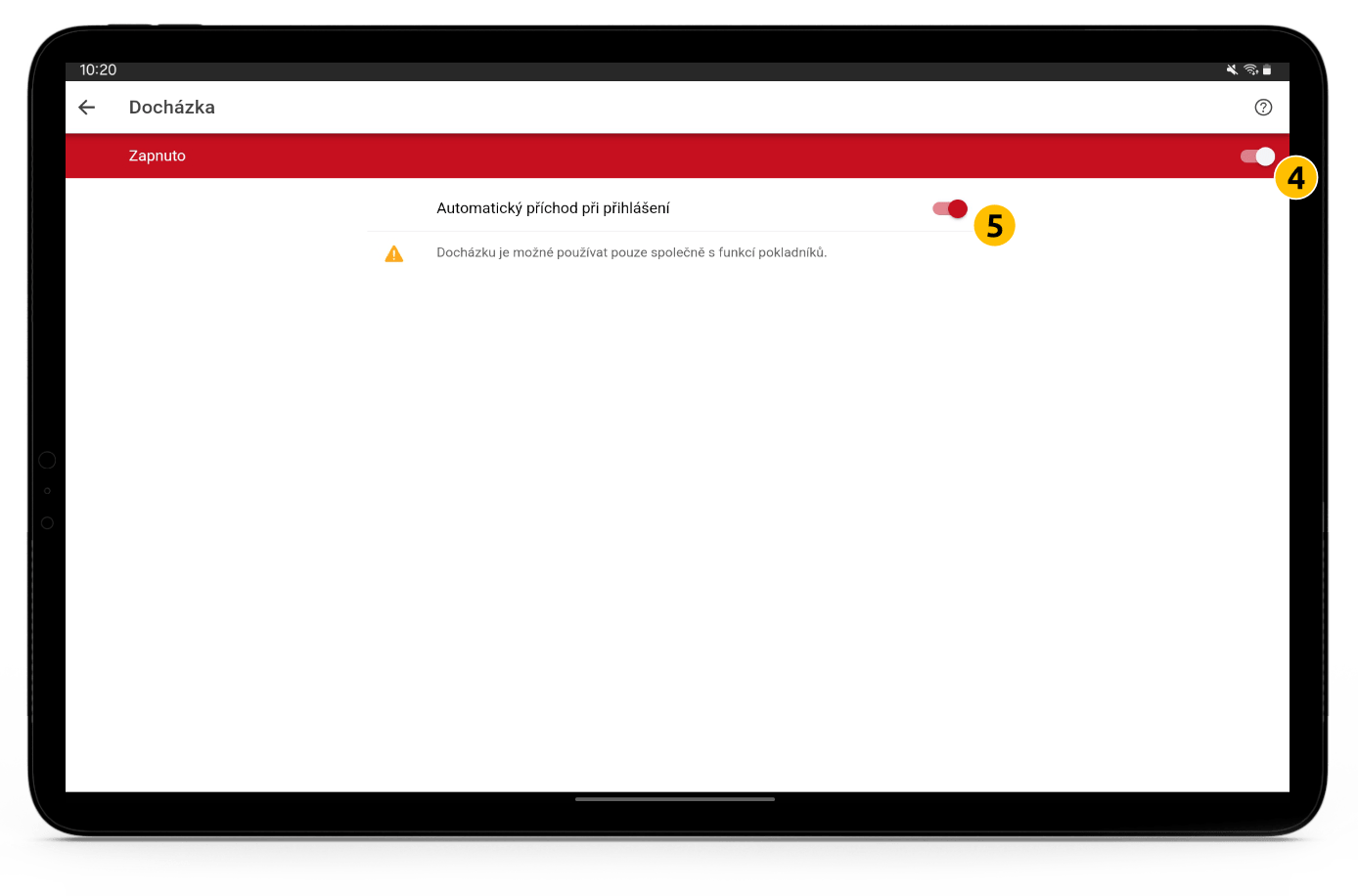 Docházku aktivujte (4) a dále máte možnost volby automatického příchodu při přihlášení (5).