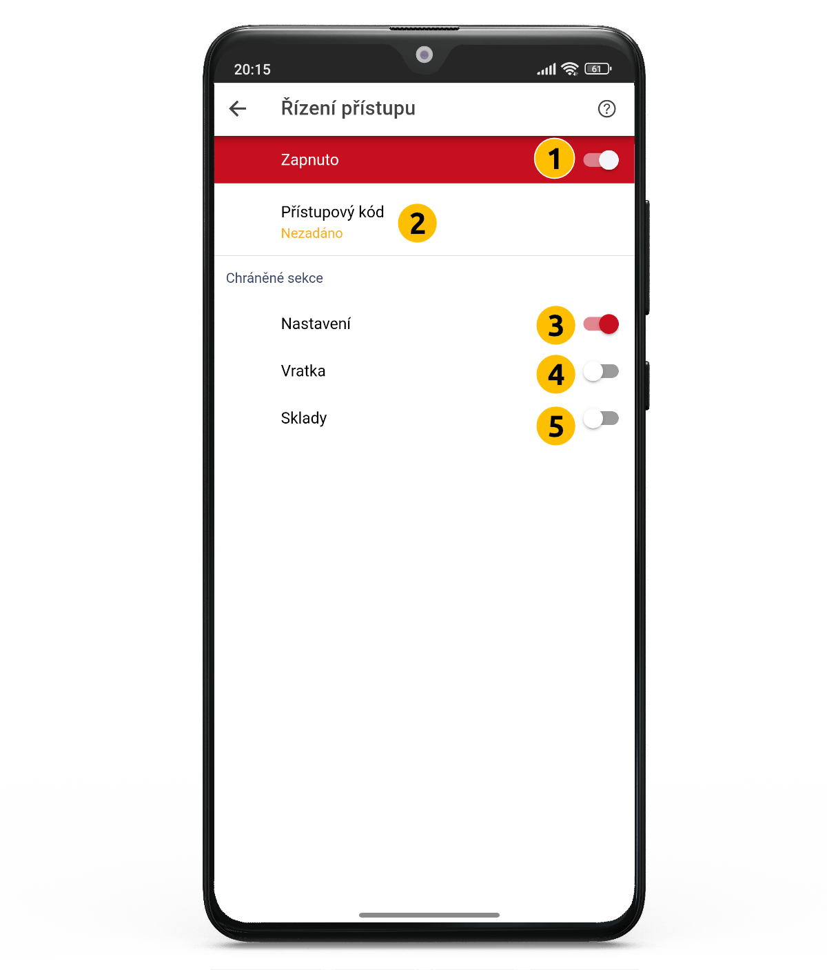 Nejdříve vytvořte PIN (2). Zadejte 4 místný číselný PIN, který bude nutné zadat pro přístup do chráněných sekcí aplikace. Dále vyberte pomocí jezdce (3, 4, 5) v pravé části obrazovky jednotlivé části, které budou přístupné pouze po zadání PIN kódu.