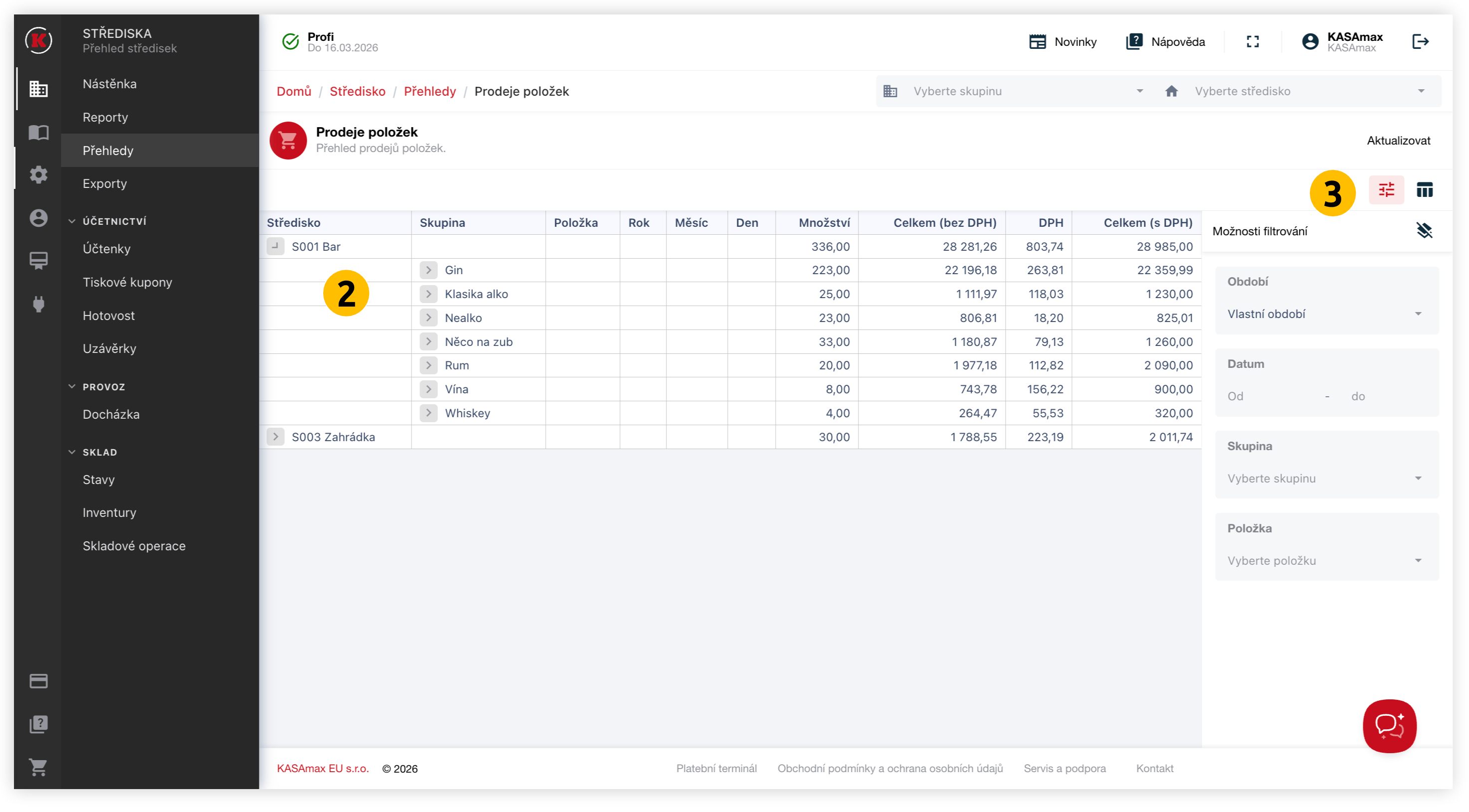 Nad přehledem Prodejů položek lze data omezit pomocí filtrů:
