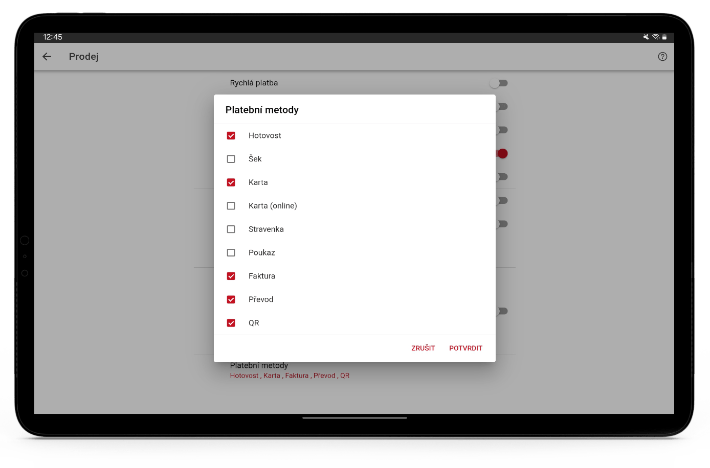 Vybrané platební metody jsou zobrazovány na obrazovce prodeje. V nabídce najdete hotovost, šek, karta, karta (online), stravenka, poukaz, faktura, převod a QR.