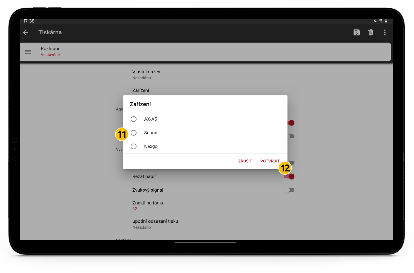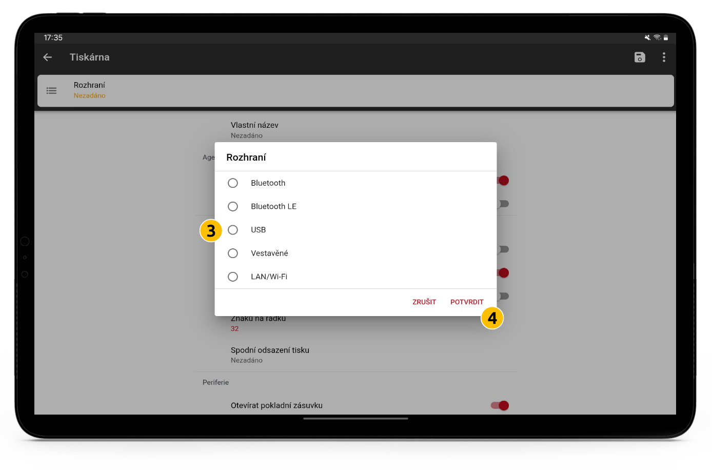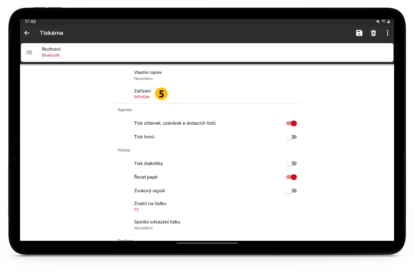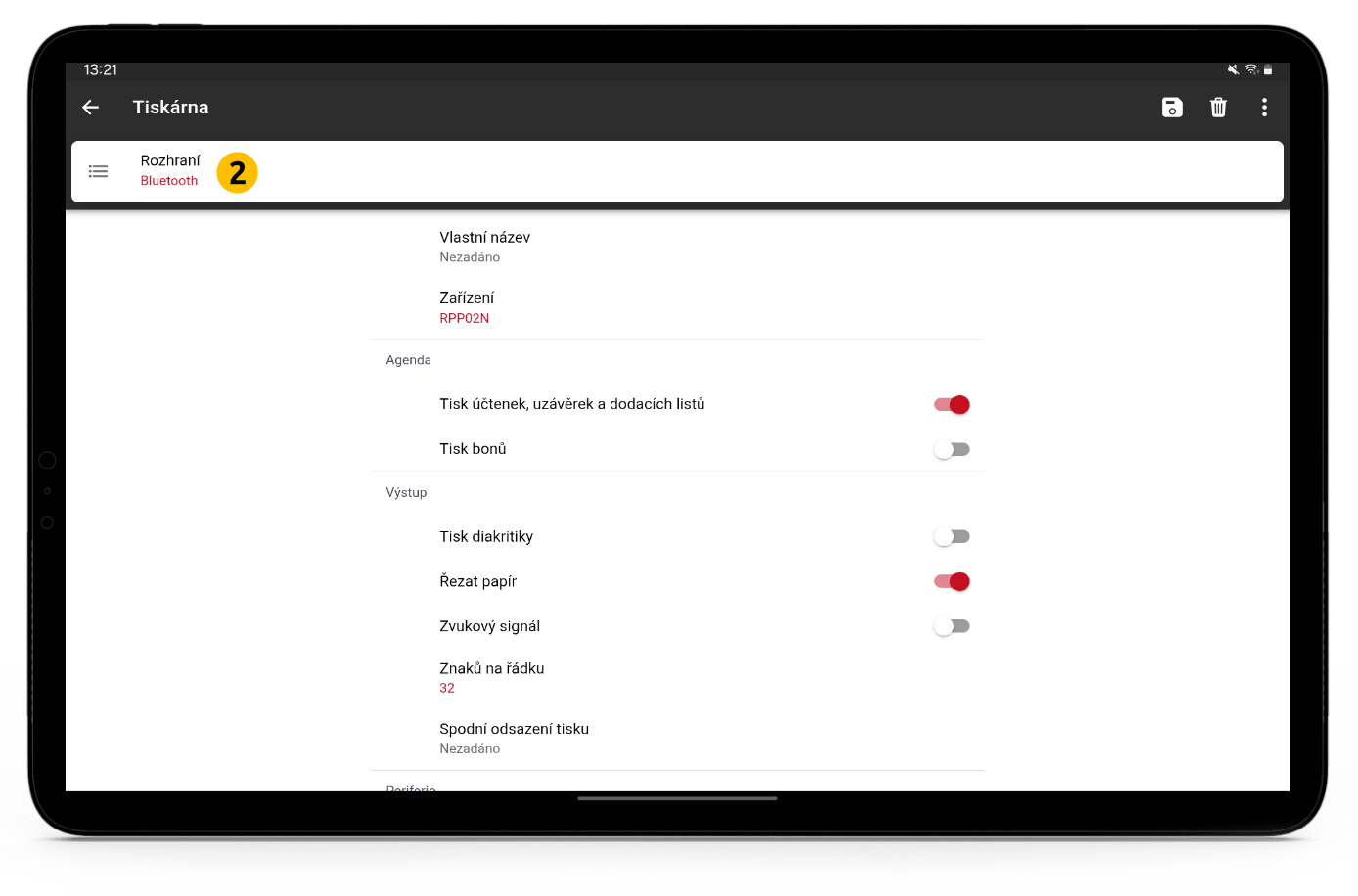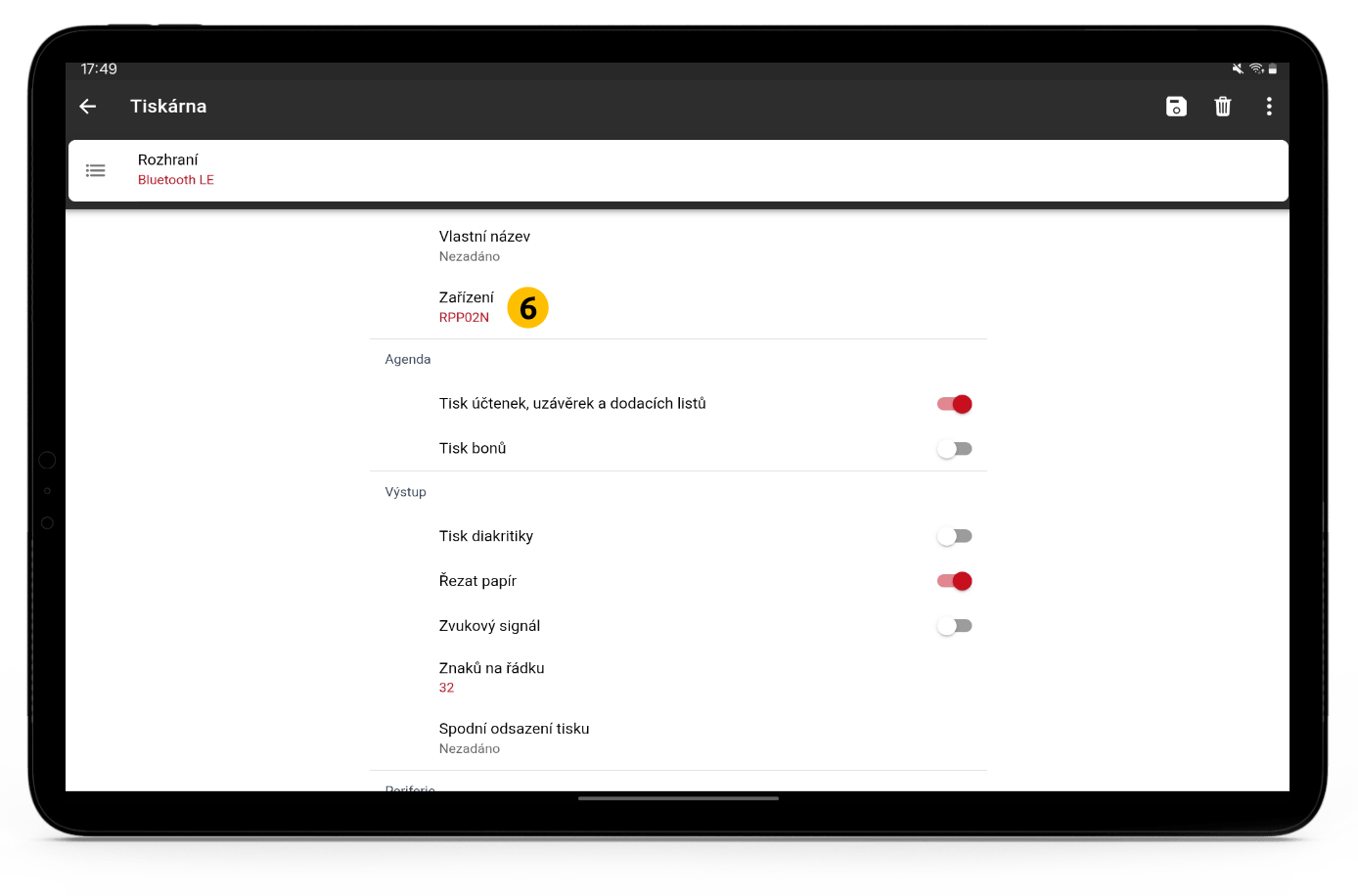 Umožňuje připojení více Bluetooth tiskáren s podporou Bluetooth LE. Šetří baterii pokladního zařízení a má rychlejší odezvy periferií. Pro připojení vyberte z nabídky zařízení (6).