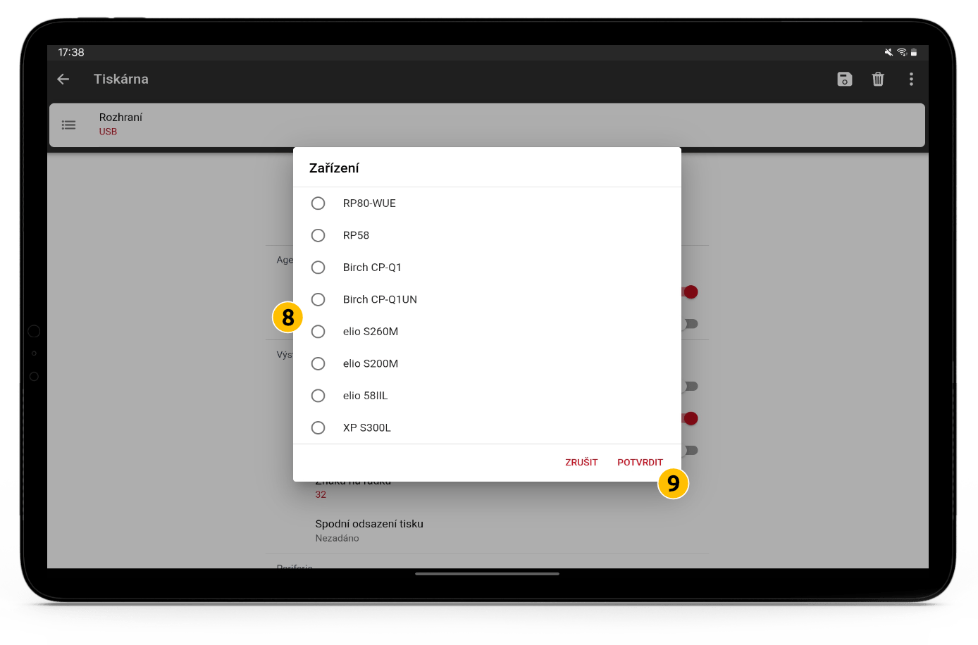 Pro nastavení vyberte tiskárnu (8) a potvrďte tlačítkem (9).