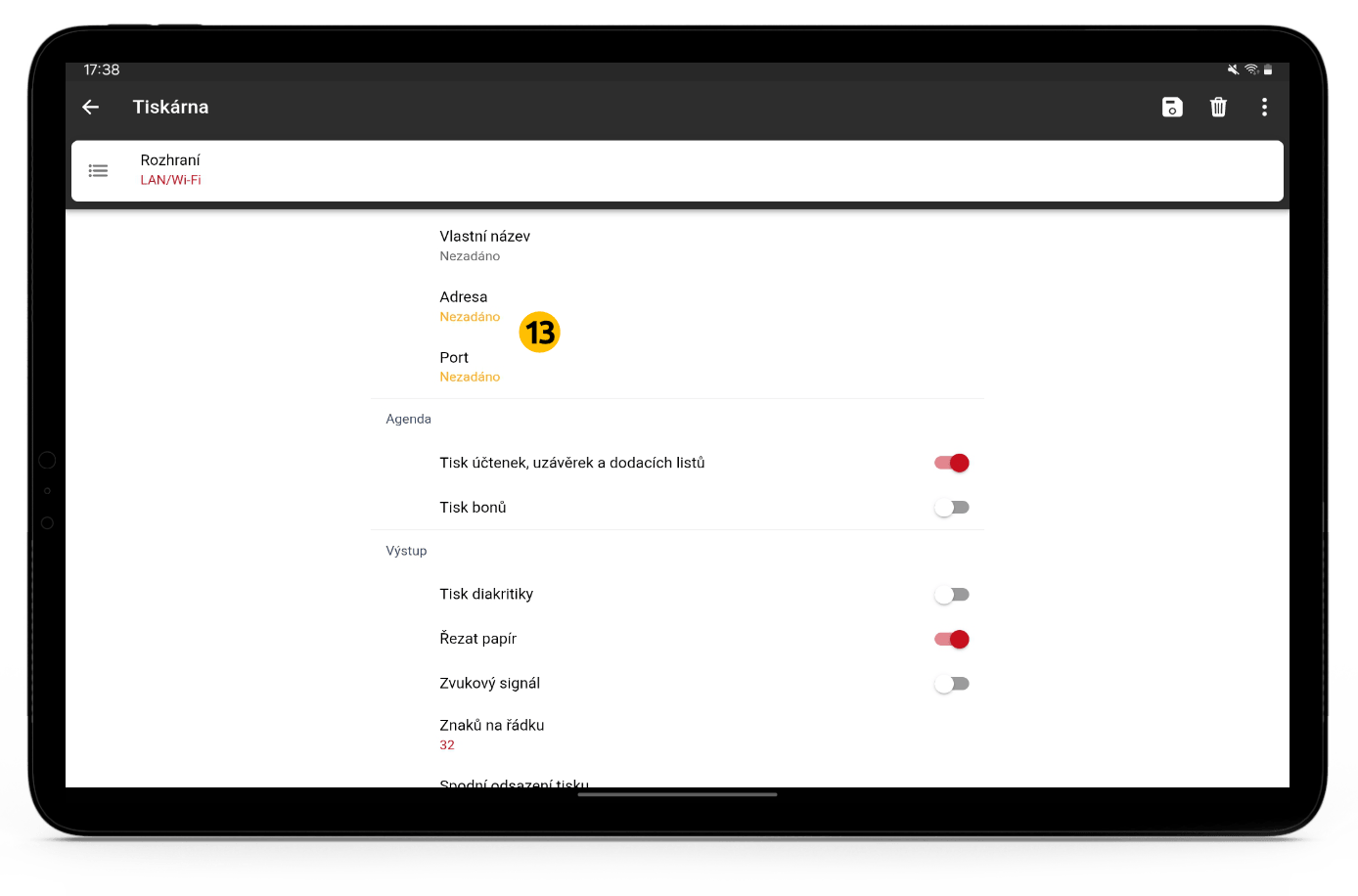Po provedení konfigurace je nutné zadat IP adresu a port, na který byla tiskárna nastavena (13).