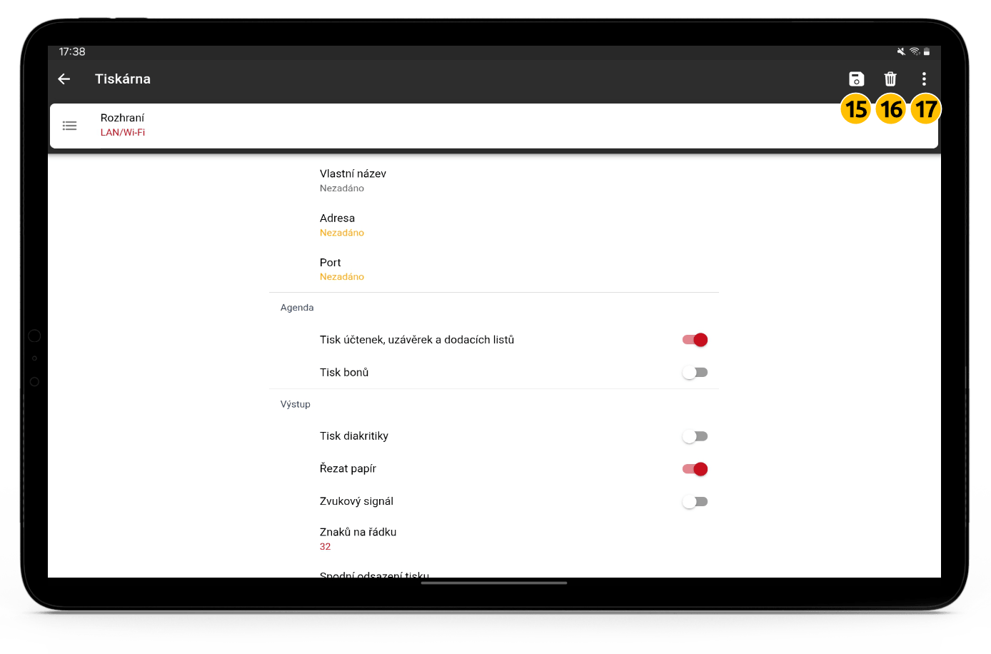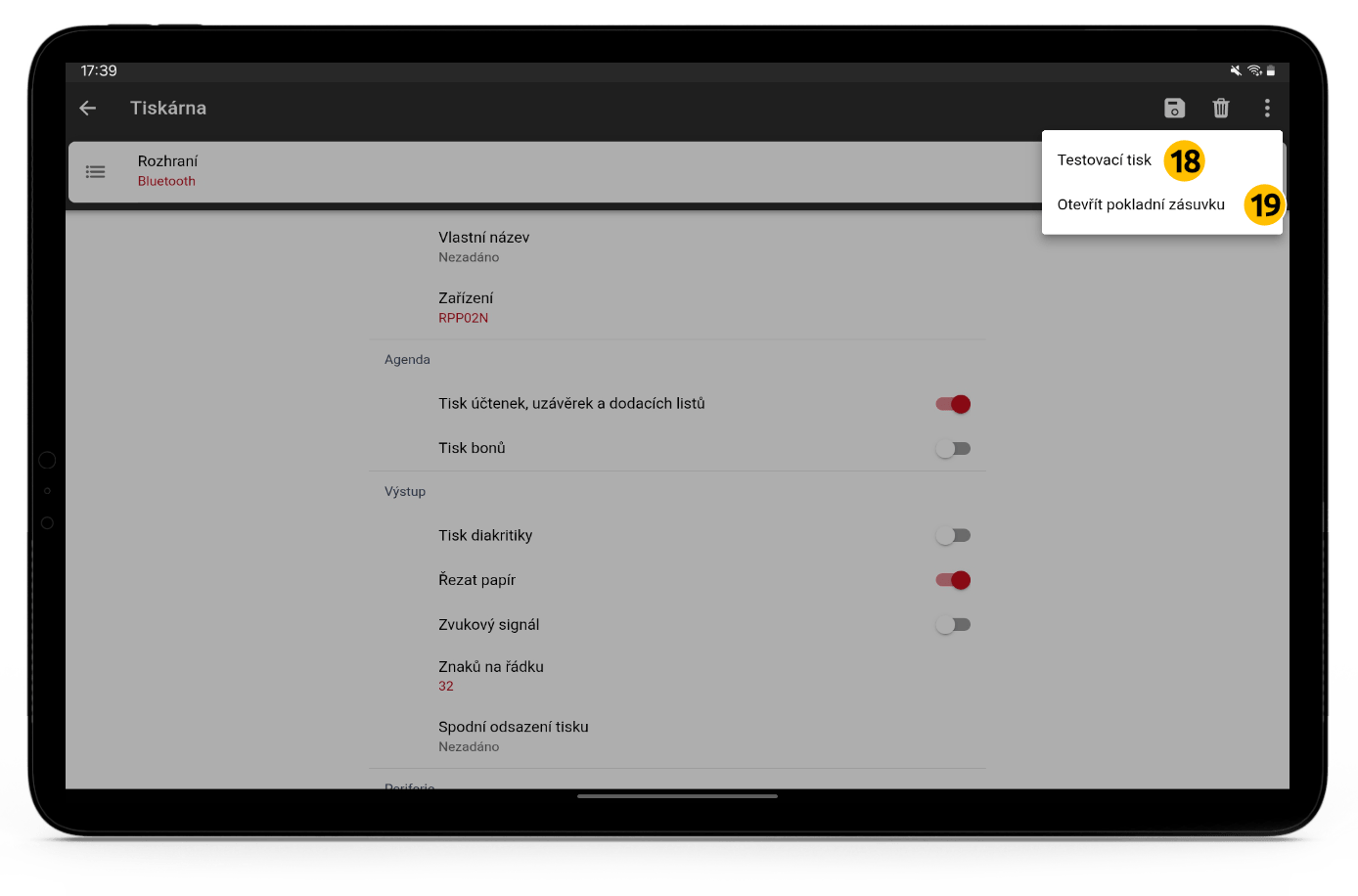 - Zkušební tisk provedete pod ikonou tří teček (17) a dále volba Testovací tisk (18).