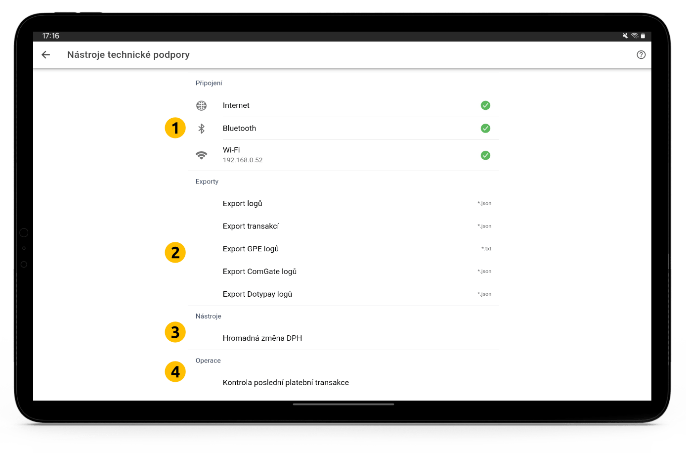 Dále zde najdete informace o Exportech (2) - Export logů a transakcí (JSON), Export GPE logů (TXT výstup do souboru), Export ComGate a Dotypay logů (JSON). V části Nástroje (3) najdete nastavené pro hromadnou úpravu DPH. V části Operace (4) potom máte možnost smazání archivních účtenek, archivních pohybů hotovosti, uzávěrek, docházek, přeuložení lokálního sortimentu, smazání úložiště obrázků a nahrání sortimentu do vzdálené správy.