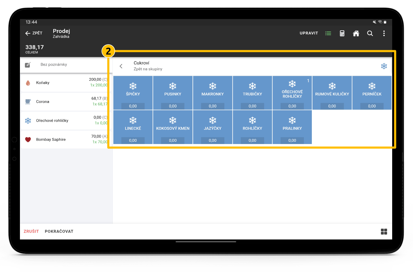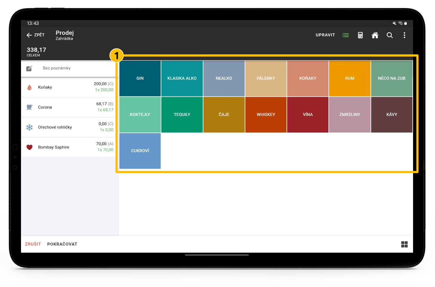 V režimu prodeje na skupiny máte zobrazeny skupiny (1) z Vašeho sortimentu.