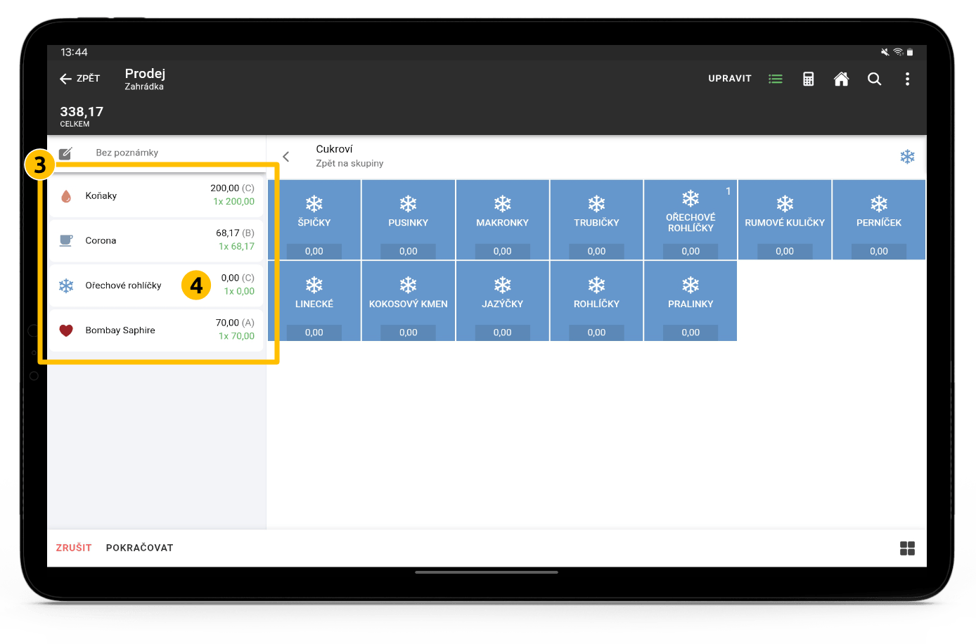 Po klepnutí na položku je položka přidána na účet (3). Aktuální množství dané položky na účtu je zobrazeno na pravé straně položky (4).