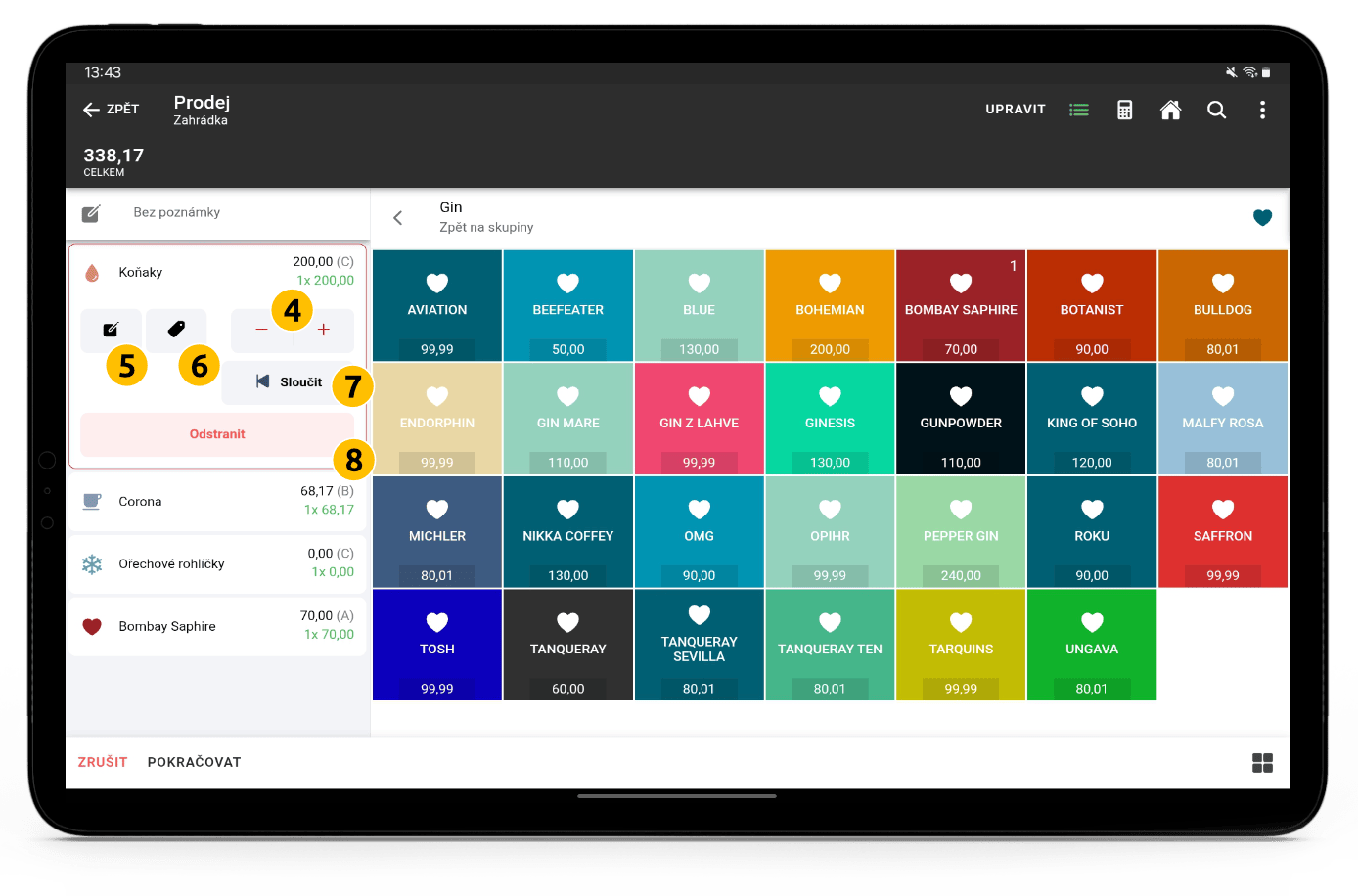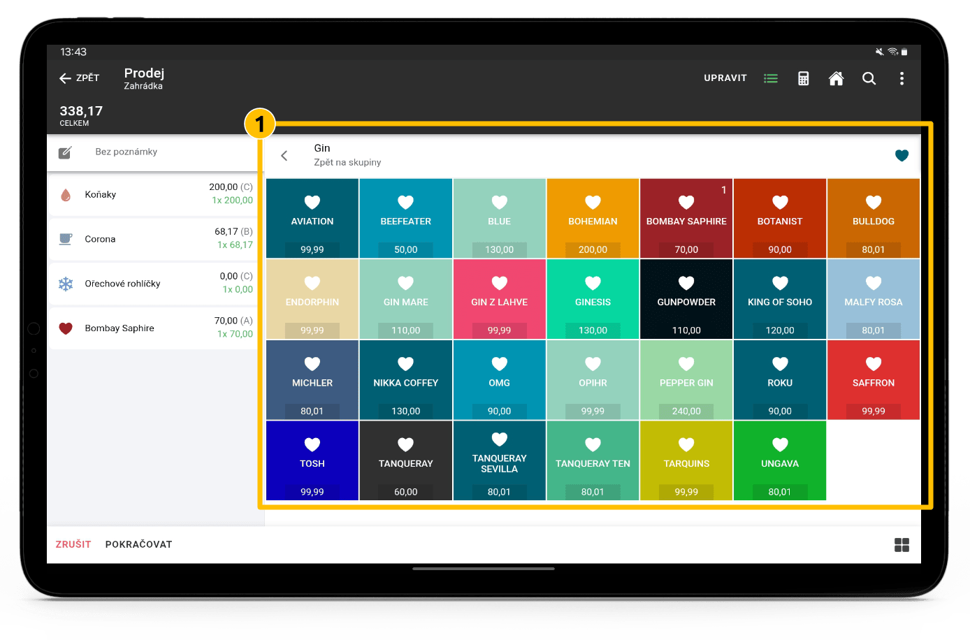 V režimu prodeje na položky jsou na obrazovce zobrazeny všechny položky (1). Ikony a barvy jsou nastaveny u položky, v případě absence nastavení jsou převzaty ze skupiny, do které položka spadá.