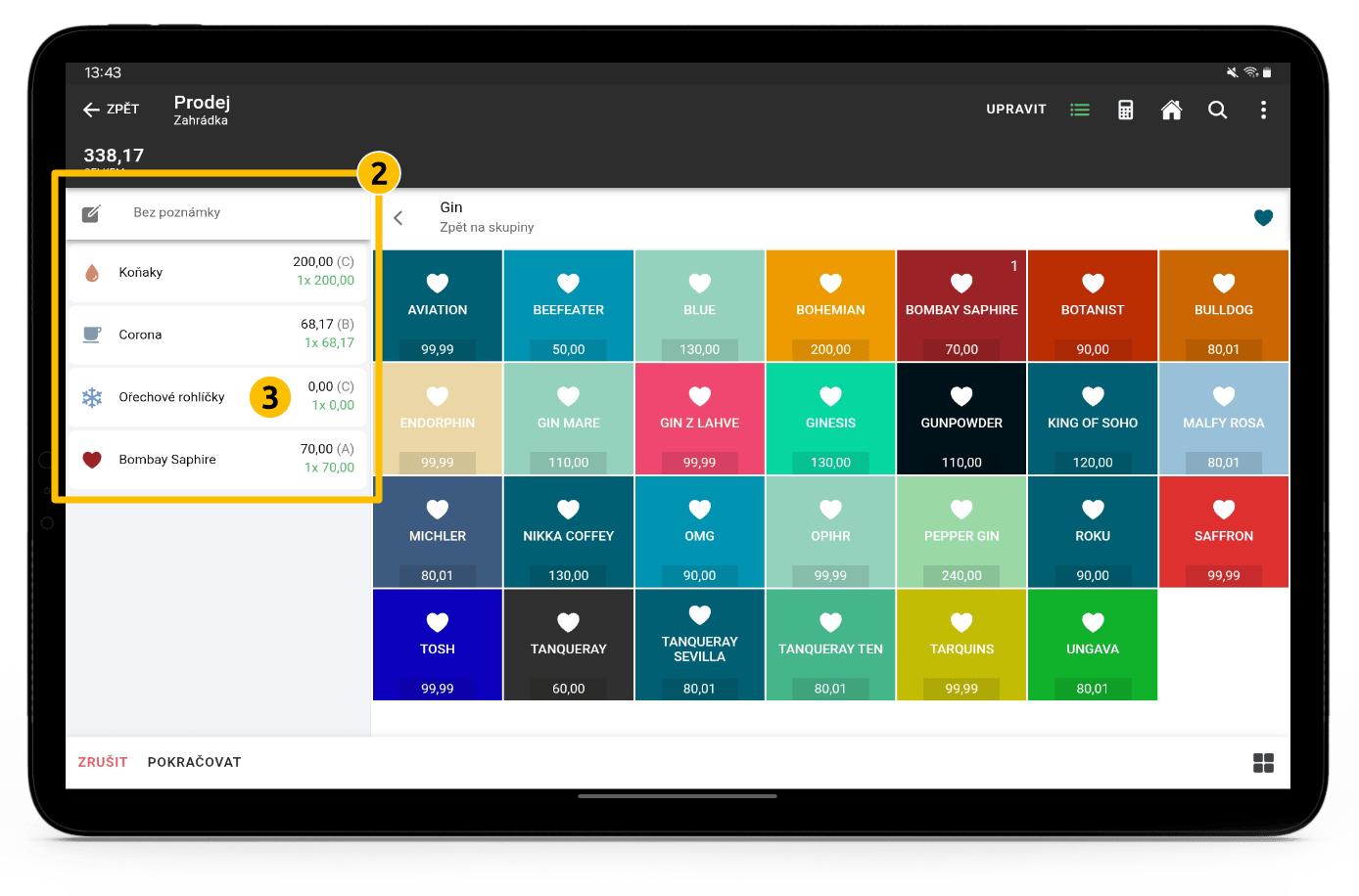 Po klepnutí na položku je položka přidána na účet (2). Aktuální množství dané položky na účtu je zobrazeno na pravé straně položky (3).