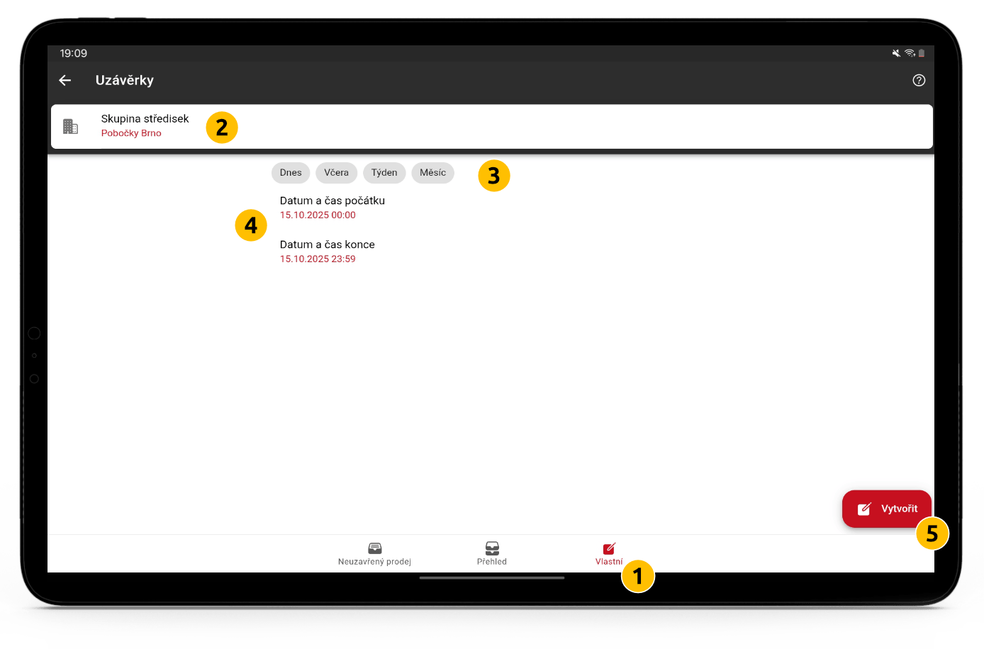 Vlastní uzávěrky najdete v záložce Vlastní (1). Uzávěrku vytvoříte vybráním střediska (2), pokud jej používáte a dále pokračujete zvoleným termínem z výběru (3) nebo zadáním data od / do (4). Uzávěrku vytvoříte tlačítkem vpravo dole Vytvořit (5).